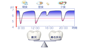 歯は食事の度に歯を形作るミネラルが細菌による酸で脱灰し、唾液によって中和されて再石灰化することを繰り返しています。3度の食事以外にも甘い飲み物や飴など間食が多い人は、その間歯が脱灰し続けているので、唾液による中和が間に合いません。つまり、歯がずっと溶けている状態になるのです。また、寝る前の飲食は非常に危険です。なぜなら、睡眠中には唾液がほとんど出ないからです。むし歯は、脱灰と再石灰化のバランスが壊れた時に出来てしまいます。間食をしないではなく、決まった時間に食事を取ることや、間食は食後すぐに取るなどの工夫をして、脱灰と再石灰化のバランスを保つことが大切です。